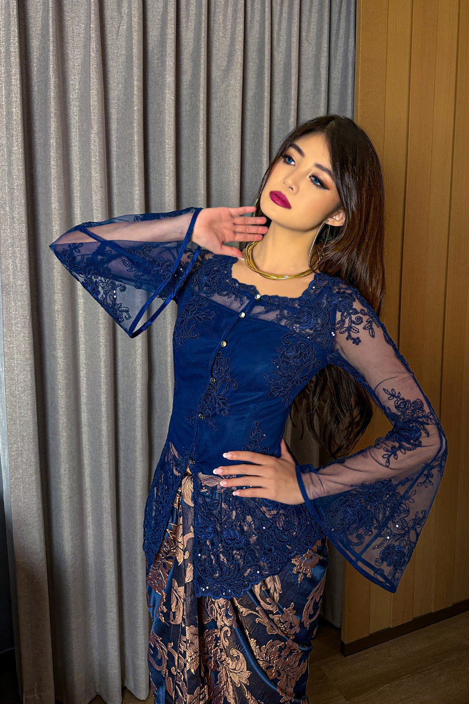 Seraphine captures the quiet elegance of twilight celebrations. Crafted in royal blue lace and paired with an opulent blue and gold brocade skirt, this kebaya embodies the graceful femininity that defines festive evenings during Hari Raya.