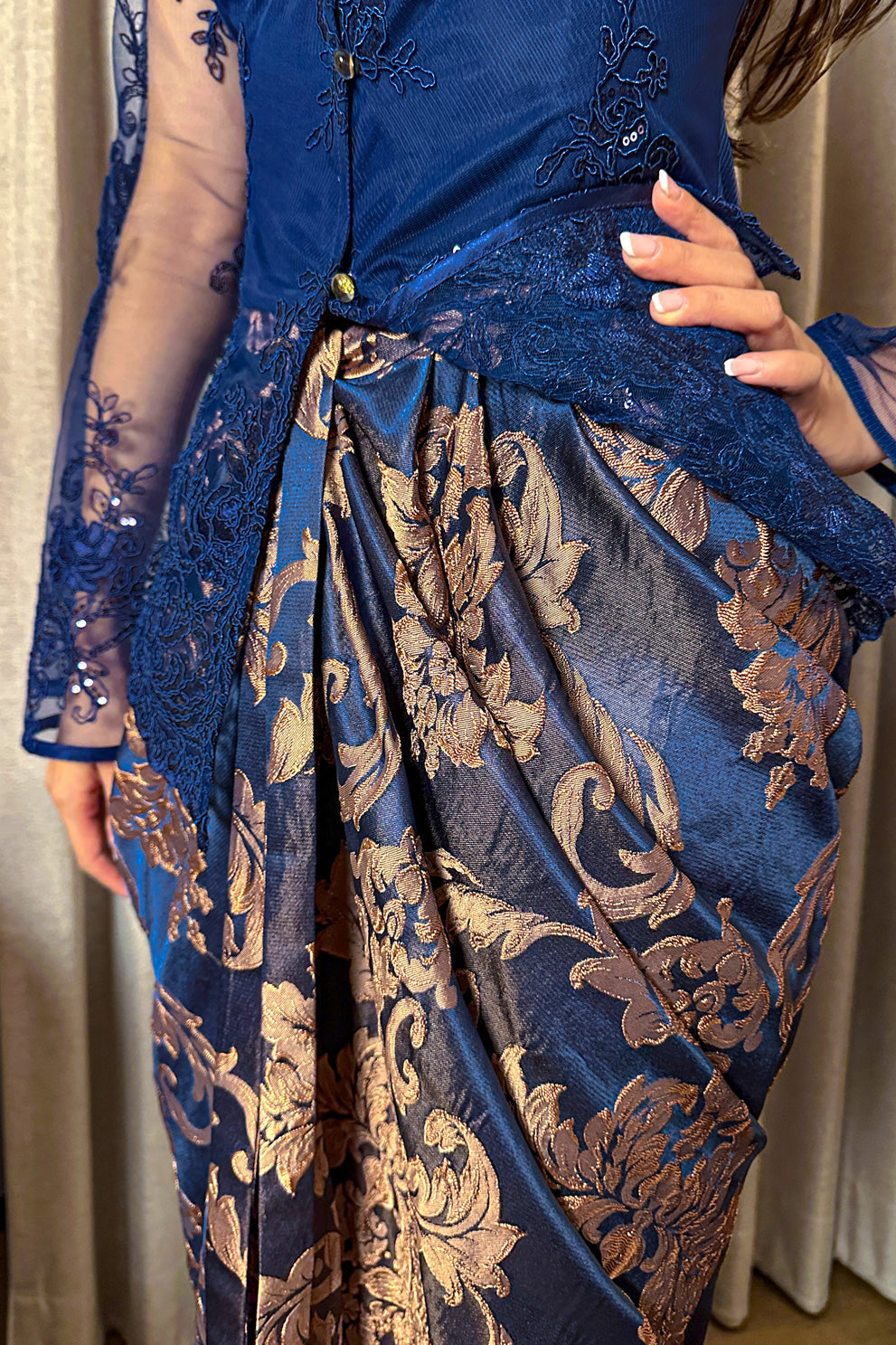 The lace bodice features intricate embroidery and delicate sequins that shimmer softly against the rich blue fabric. A scalloped neckline and sheer lace sleeves lend an air of refinement, while the fitted tailoring gently contours the silhouette. Finished with a luxurious brocade skirt woven in classic gold motifs, Seraphine is designed for the woman who carries tradition with effortless elegance.