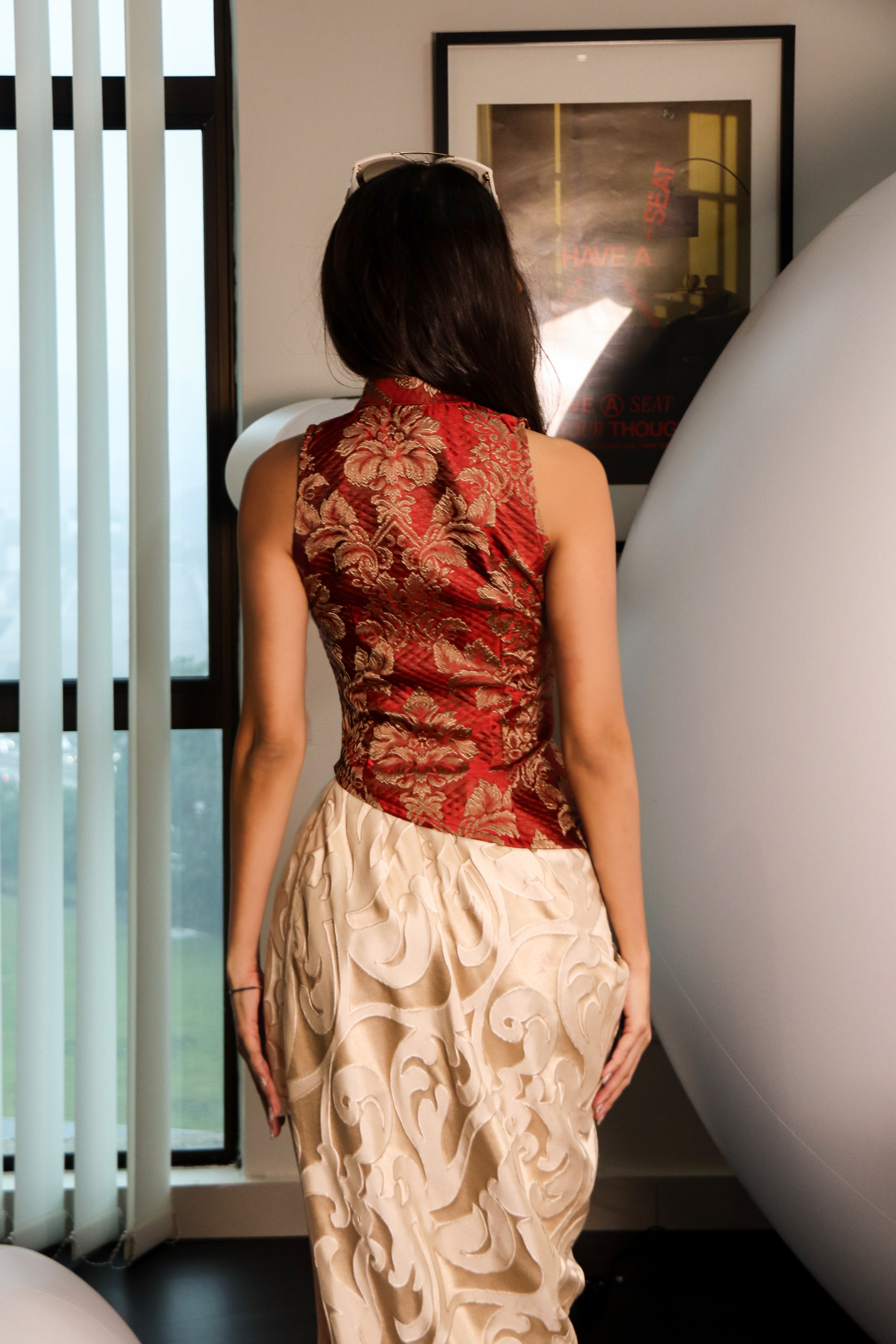 A beautifully structured piece that instantly elevates any outfit, this brocade halter qipao top is crafted in a ruby red tone with delicate floral motifs that catch the light effortlessly. Designed to contour the waist and frame the neckline with a modern mandarin collar, it blends classic Chinese-inspired elegance with a clean, contemporary silhouette you can style beyond the festive season. Wear it with tailored trousers, draped skirts or denim - it’s a versatile statement separate that makes you look polished with minimal effort.