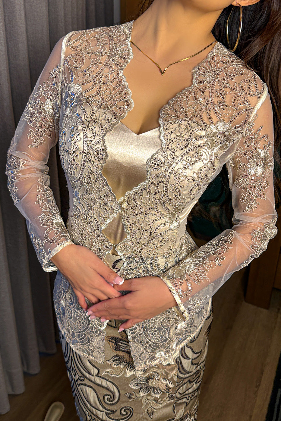 The lace panels frame the silhouette beautifully, forming an elegant neckline that flatters the décolletage while maintaining the classic structure of the kebaya. Intricate embroidery and subtle sequins add gentle texture and luminosity, catching the light with understated elegance. Paired with a luxurious pleated brocade skirt woven in silver-toned floral motifs, Aveline evokes the quiet beauty of heirloom pieces passed down through generations.