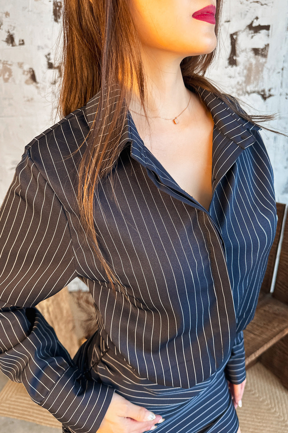 The lightweight shirt drapes fluidly over the body, while the ruched mini skirt hugs in all the right places, creating a flattering silhouette that feels easy, feminine, and wearable. Subtle pinstripes add structure and polish, balancing softness with just enough edge.