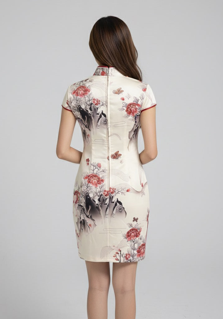 Embrace timeless elegance with the Kiyorr Sleeved Printed Qipao in Cream. Adorned with an intricate all-over floral print, this qipao features a traditional mandarin collar with delicate button detailing, short sleeves, and a flattering mid-thigh length with a subtle side slit for ease of movement. Crafted from stretchable polyester, it offers both comfort and style, making it ideal for festive occasions and memorable outings.