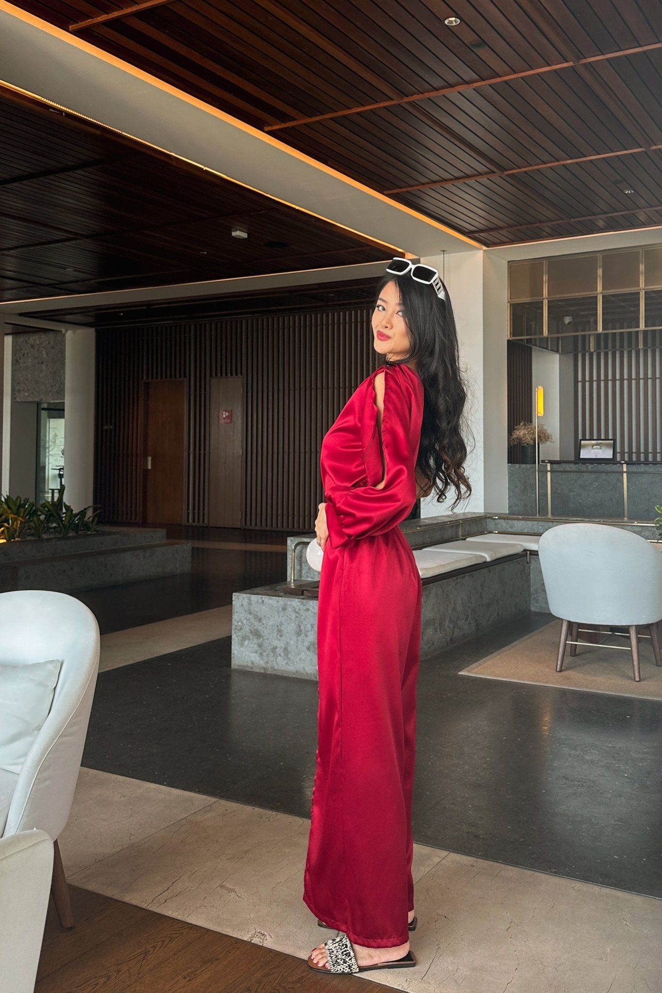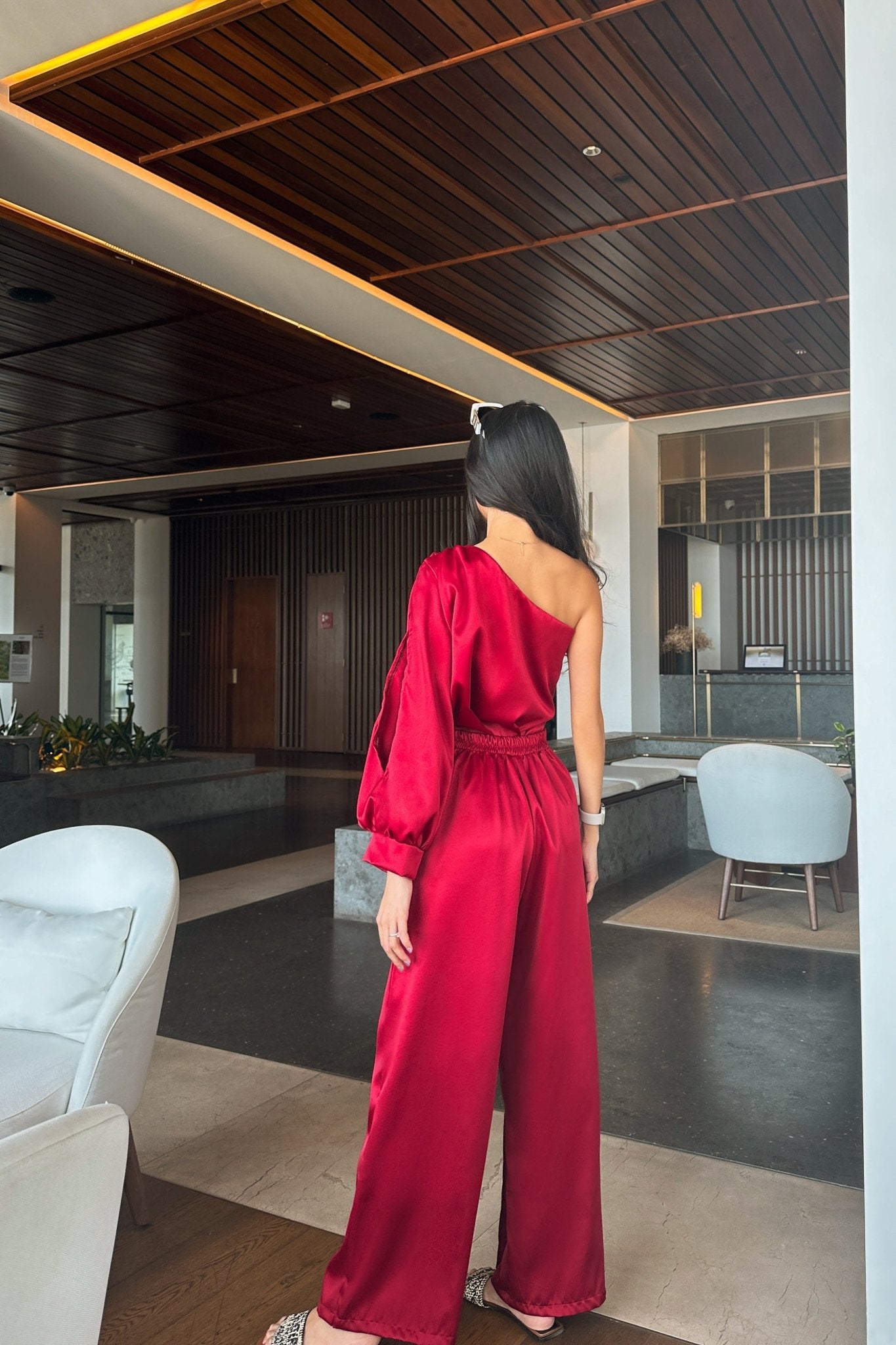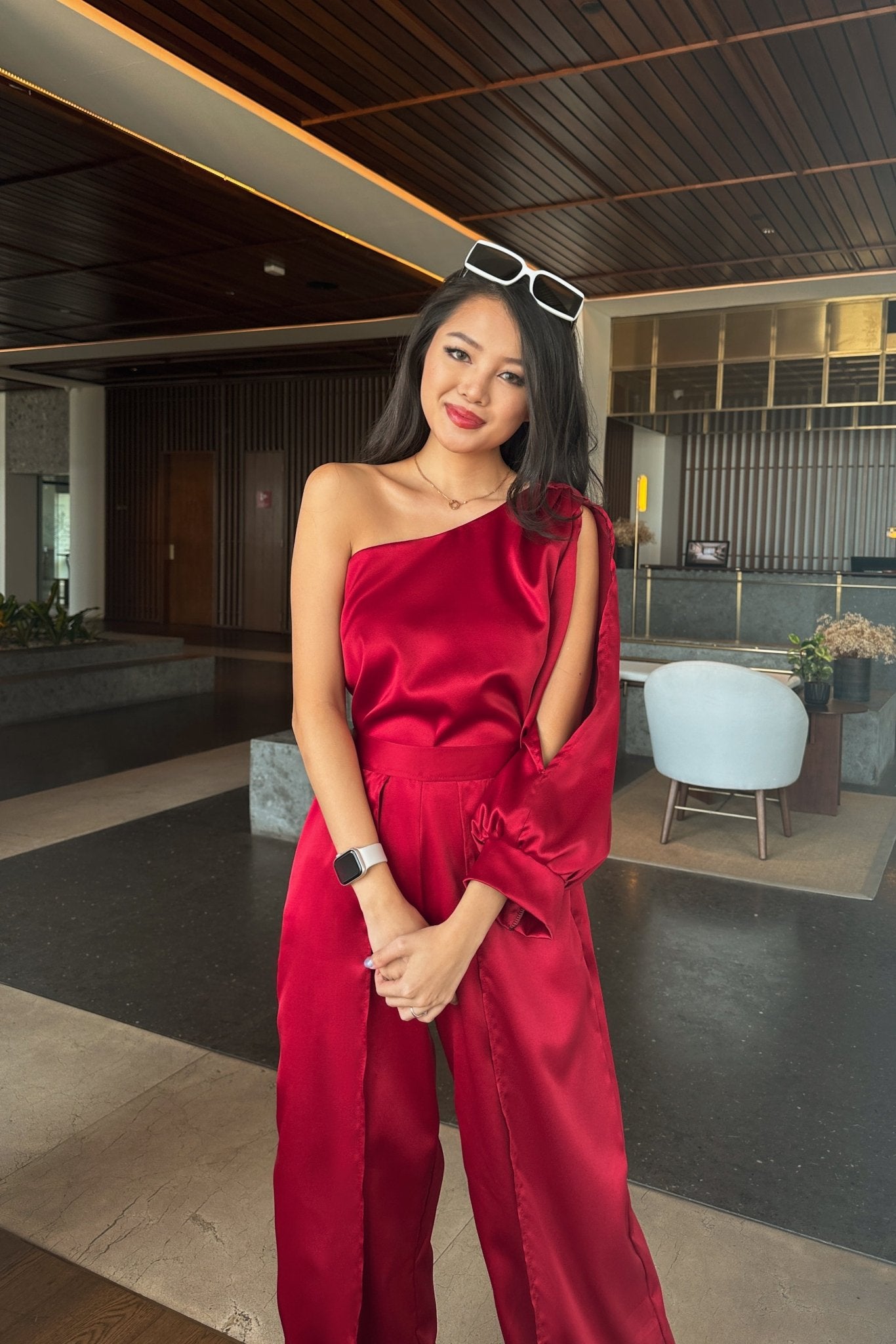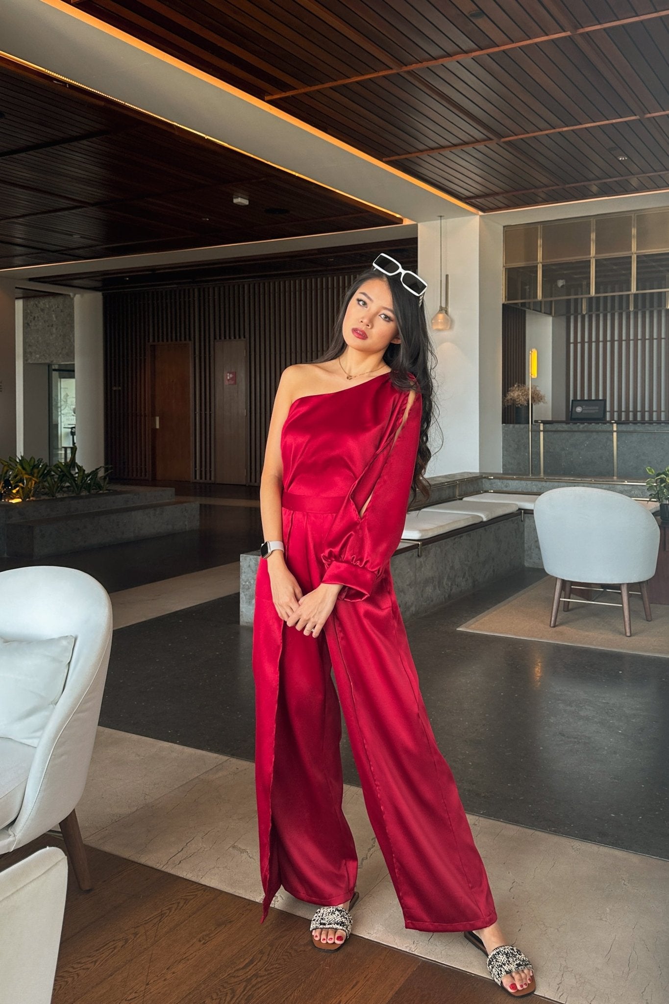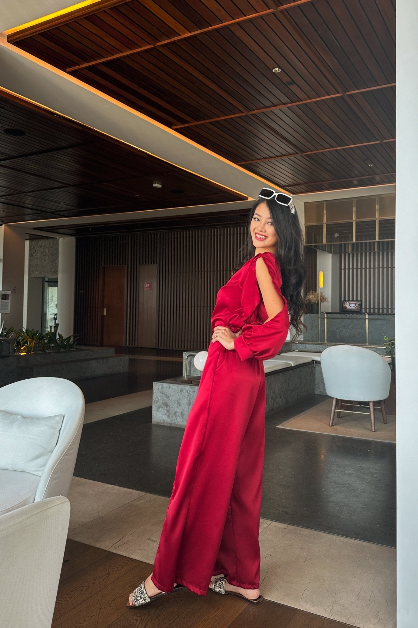 Pants: Concealed zip on left, Stretchable band of back of waist, Overlapping design on pant legs, No thigh slit on legs, Satin shine on surface.