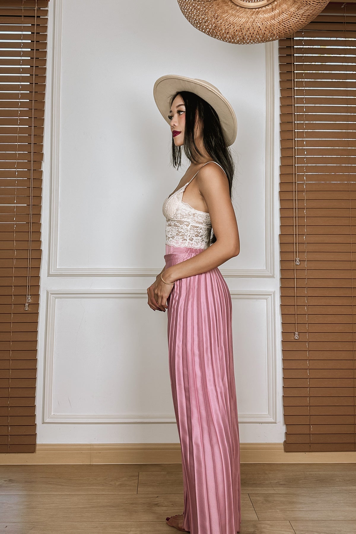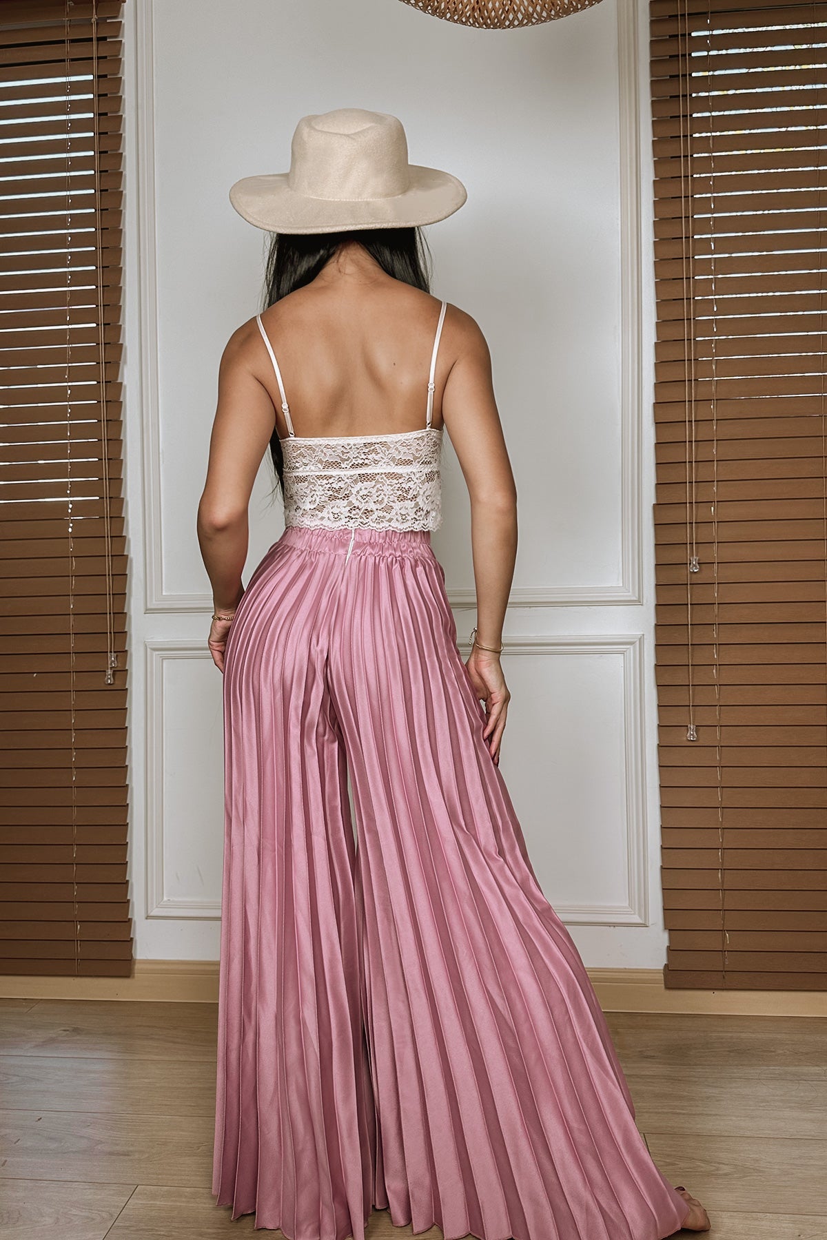 High-waisted, Concealed zip on back, Stretchable waistband on back, Pleated throughout- do not iron, Flared, wide leg design.
