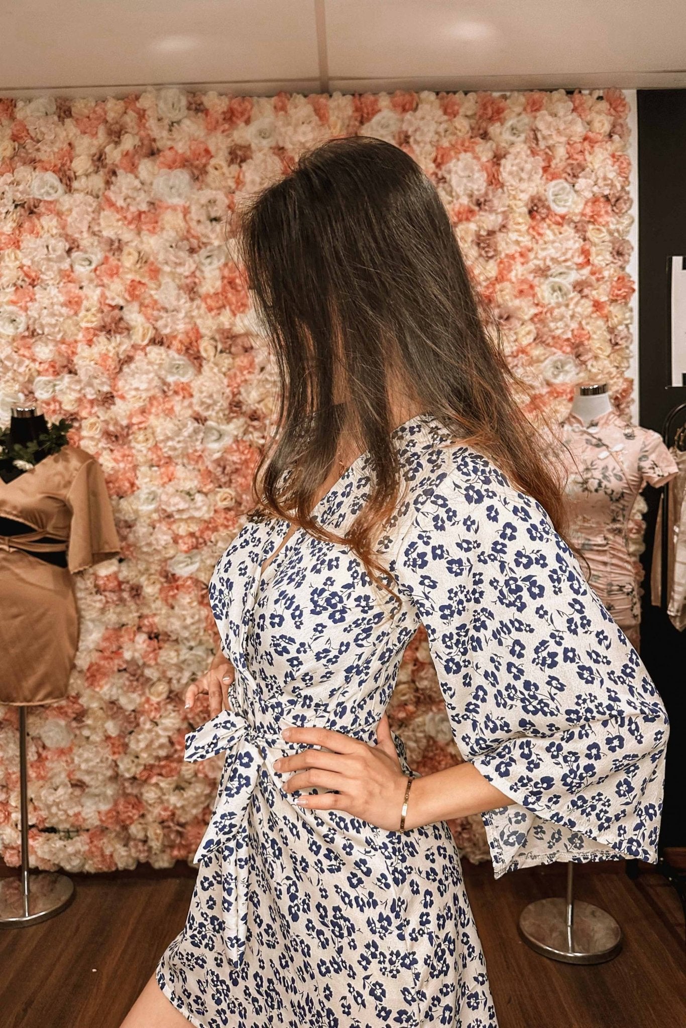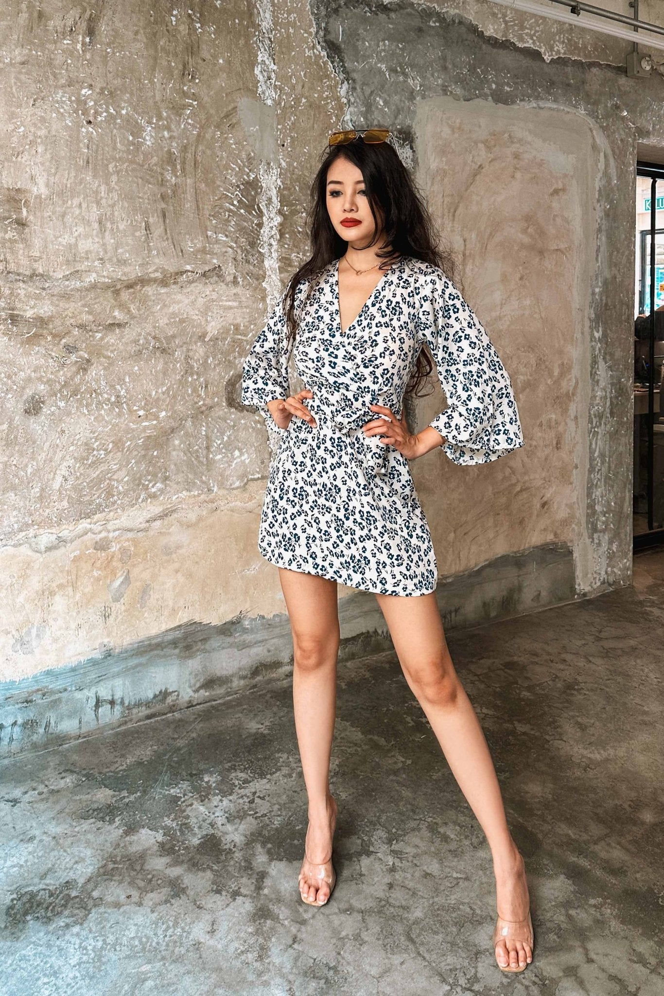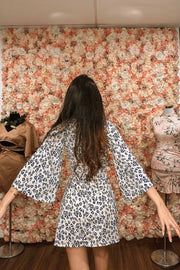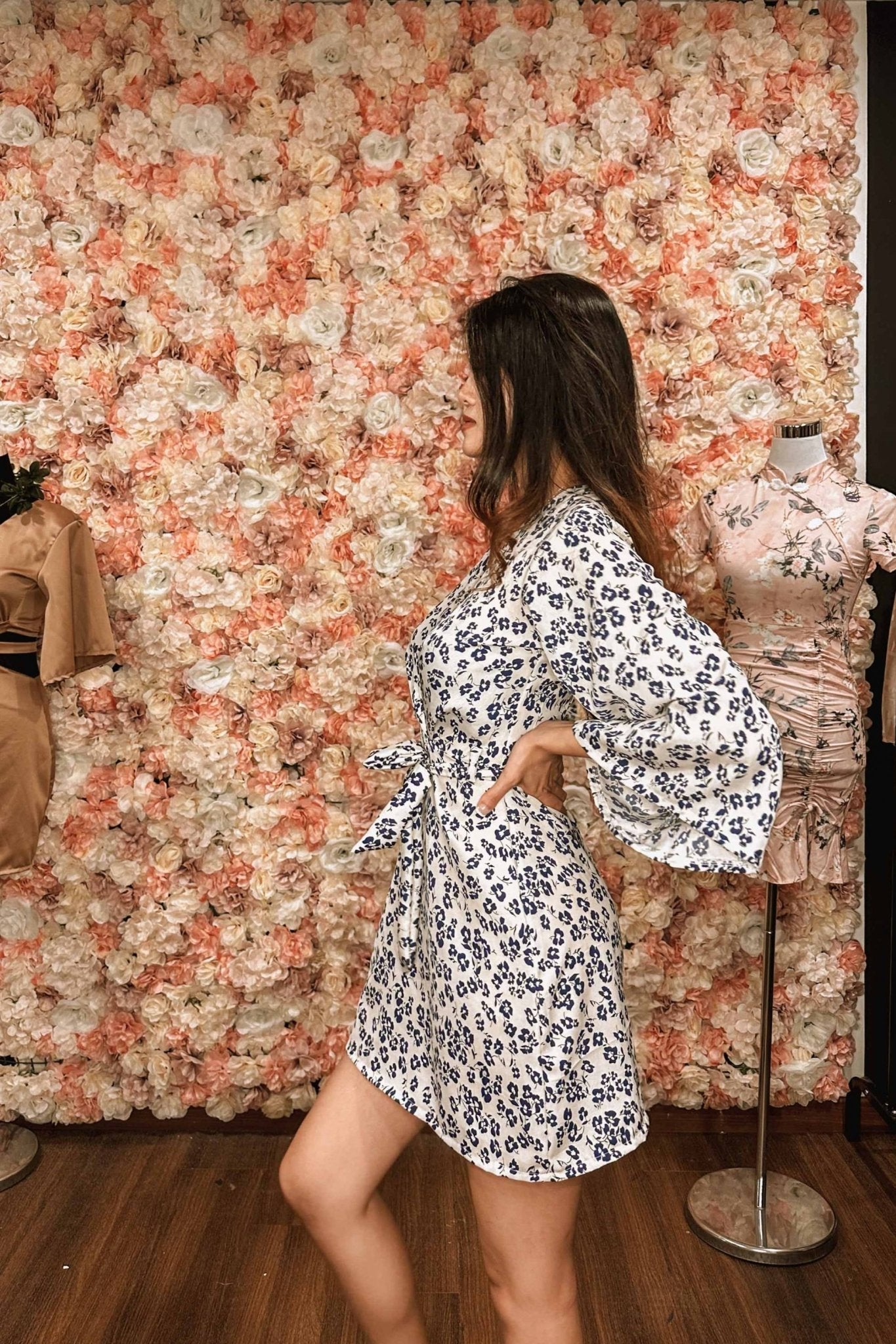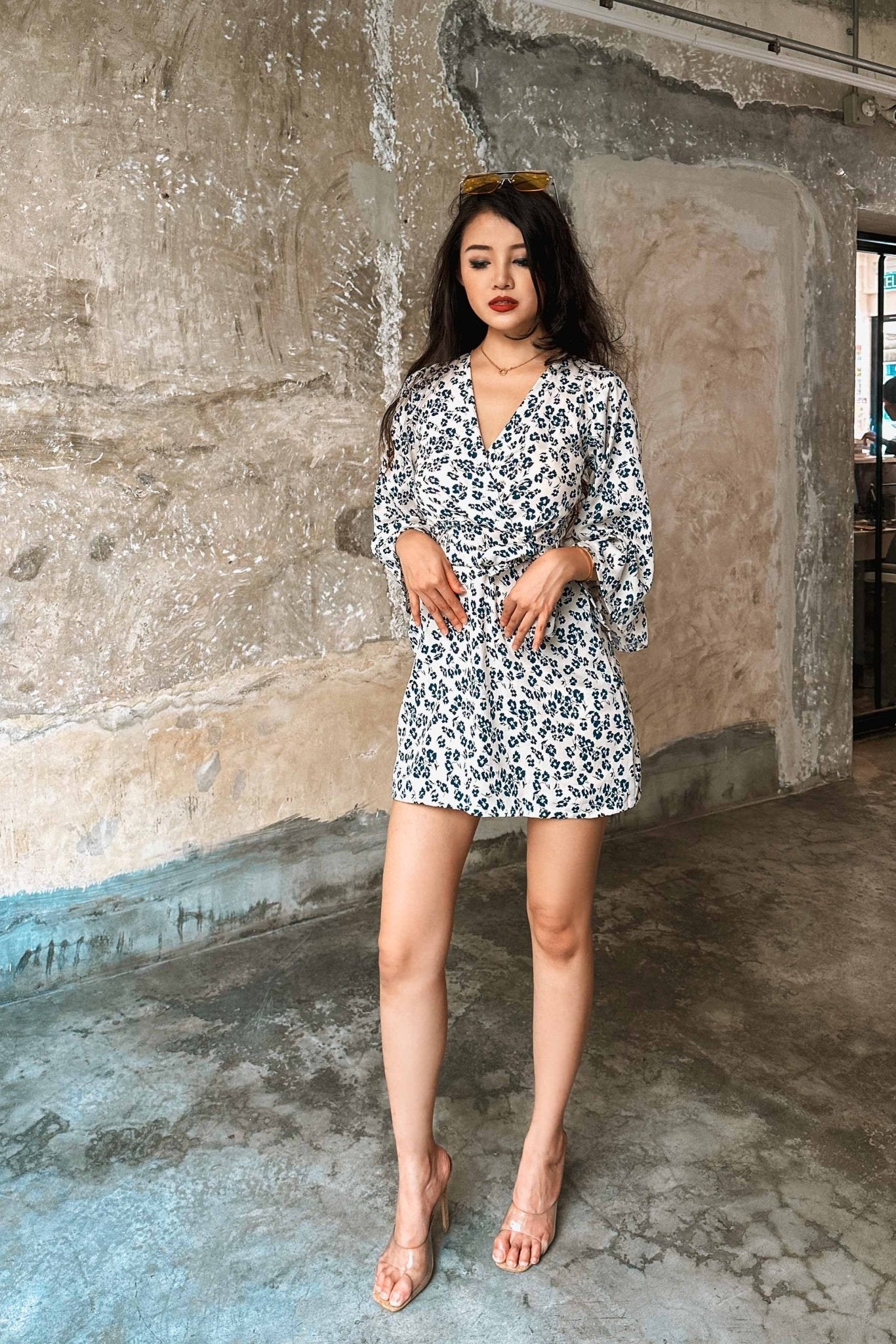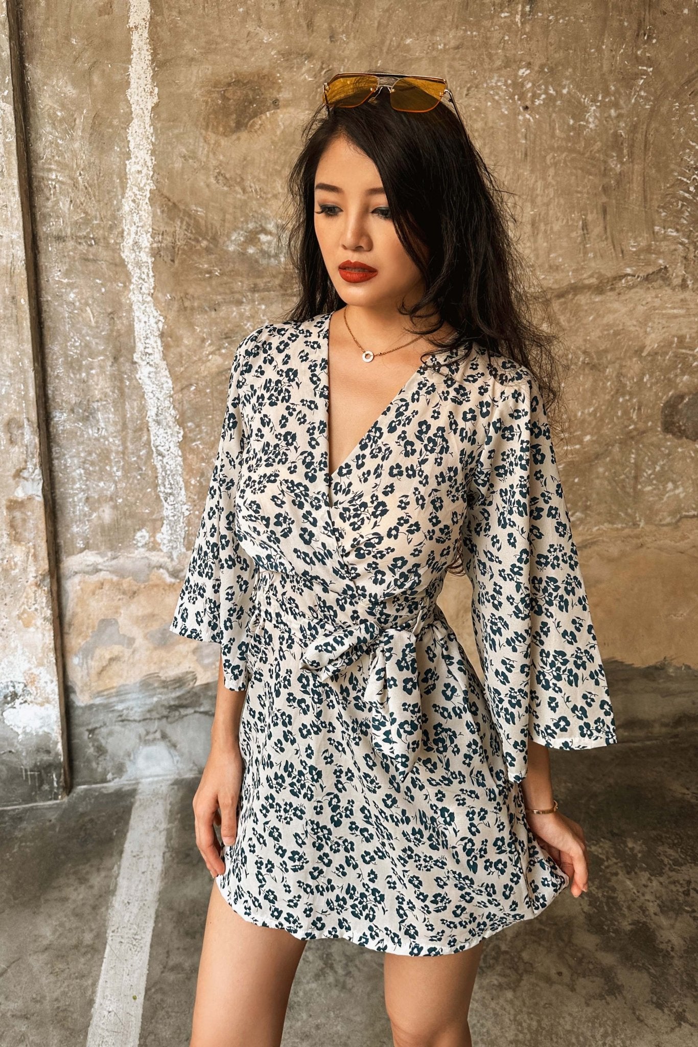 V-neckline, Concealed zip on back, Wrap design with overlapping layers on chest, Pleated design on waistline, Flared sleeve design, Removable straps on waist to tie according to waistline, Belt loops on both sides, Oversized fit above waistline, Regular fit below waistline, Print placement of each individual piece may vary.